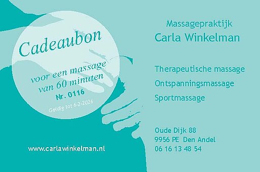 Een massagecadeaubon is één jaar geldig en kan telefonisch of per e-mail worden besteld.
